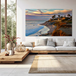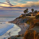 Witness the serene beauty of a Carlsbad sunset as the golden hues of the setting sun illuminate the rugged cliffs overlooking the Pacific Ocean.