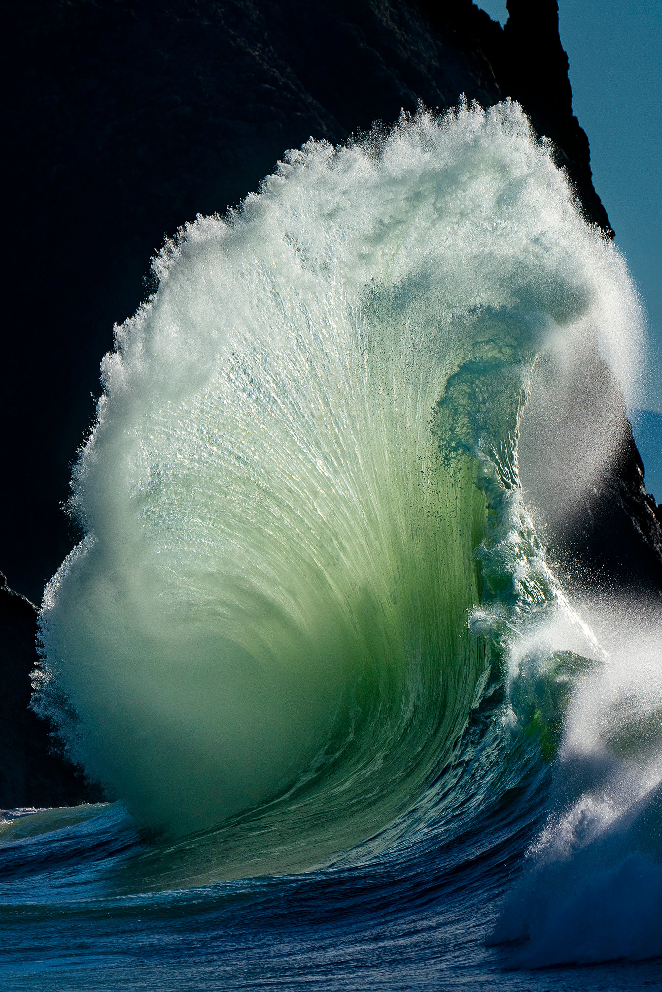 Backlit by the sun, the crest fans out in a brilliant spray of light, while the body of the wave glows with a vibrant, ethereal green against the dark, rocky shore.