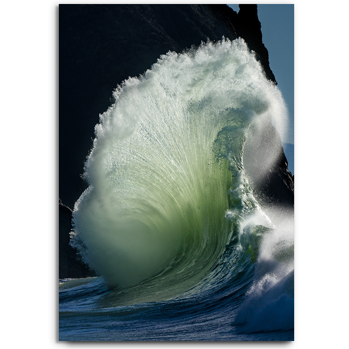 Captured off the rugged coast of Washington, this fine art photograph titled Triton freezes a moment of immense oceanic power as a wave explodes in the sunlight.
