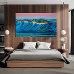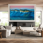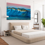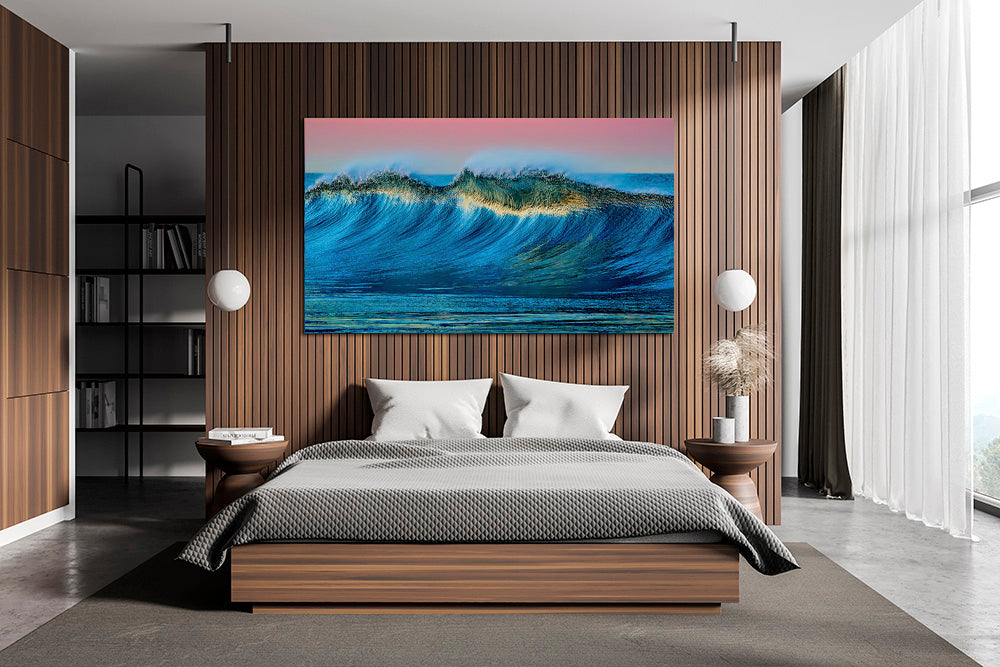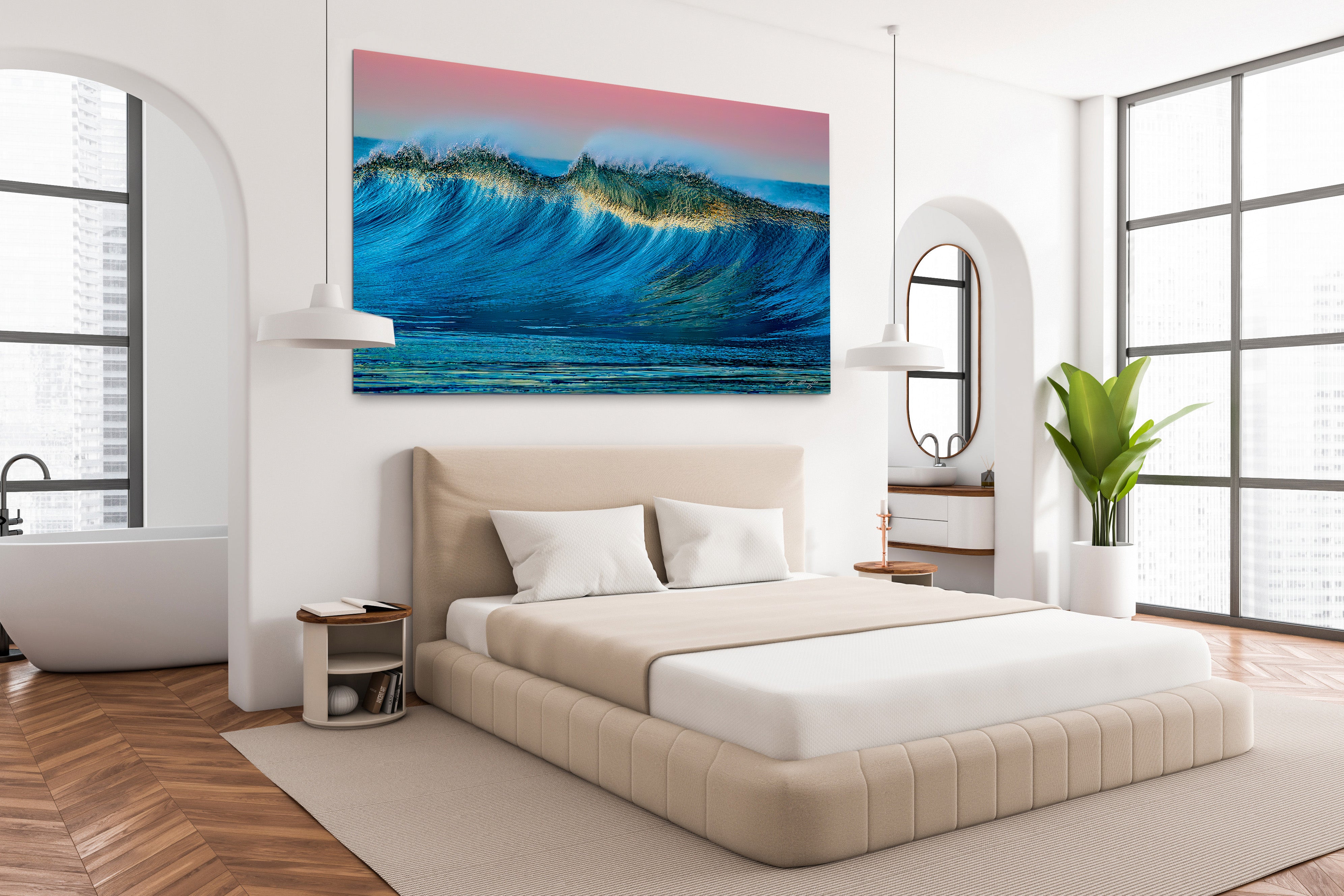 This captivating fine art photograph beautifully captures the serenity of sunrise as the soft peach tones of the sky contrast against the vivid blue face of a wave.